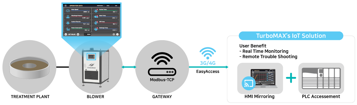 MAXCON собирает большое количество данных о работе воздуходувки в режиме реального времени и регулирует скорость потока через наиболее эффективную рабочую точку и оптимальное количество рабочих воздуходувок для снижения энергопотребления всей системы.